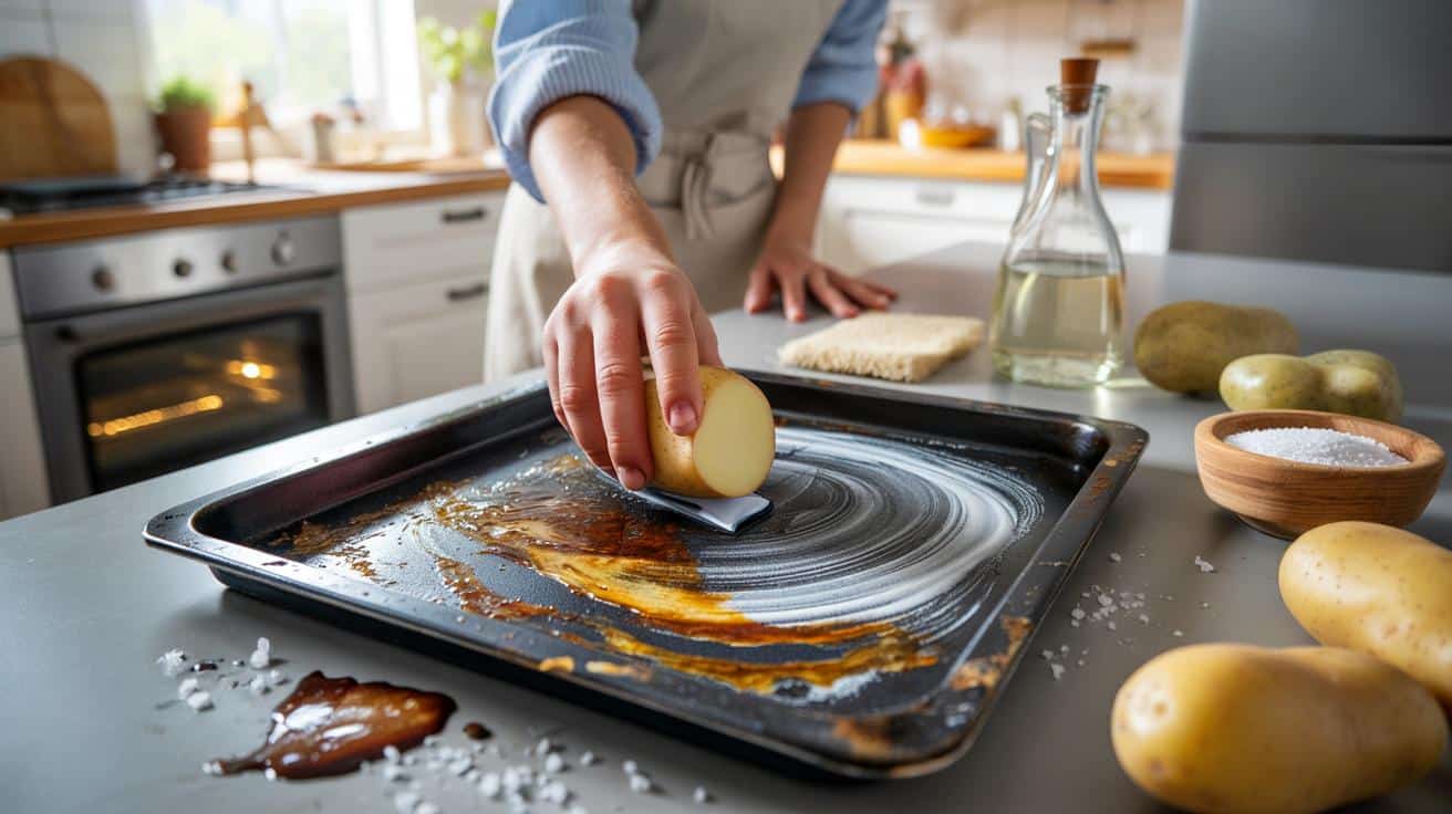 Een simpele aardappel en wat keukenzout kunnen genoeg zijn om een doffe, aangekoekte bakplaat weer te laten glanzen.