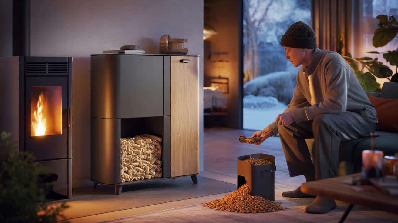 Een opslagmeubel dat 40 tot 50 kilo pellets bevat, bespaart tientallen zakverplaatsingen per maand tijdens piekverwarming.