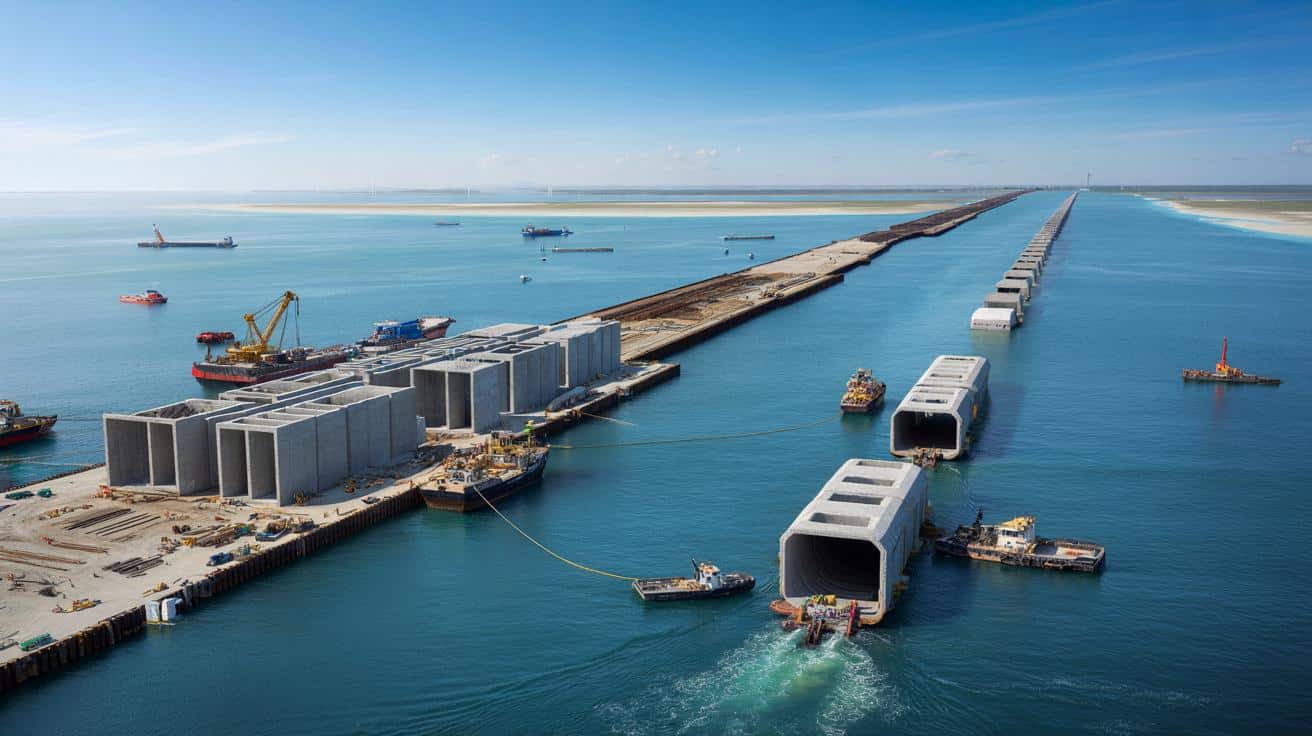 Voor wie het begrip nog wat abstract blijft: een afgezonken tunnel is geen geboorde buis, maar een reeks kant‑en‑klare doosconstructies die op de bodem worden geplaatst. Deze methode werkt vooral goed in relatief ondiep water met een stabiele ondergrond.